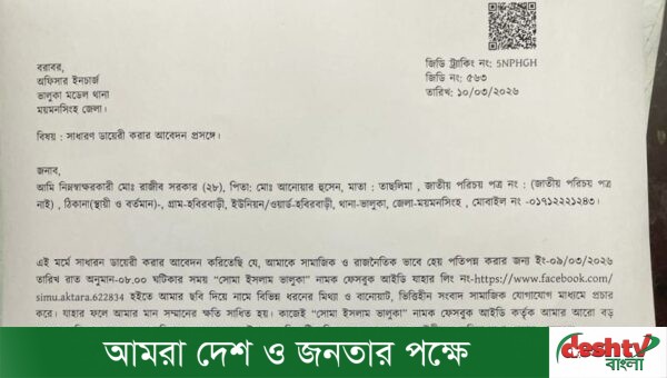 আমি এই মর্মে সাধারন ডায়েরী করার আবেদন করিতেছি যে, আমাকে সামাজিক ও রাজনৈতিক ভাবে হেয় পতিপন্ন করার জন্য ইং-০৯/০৩/২০২৬ তারিখ রাত অনুমান-০৮.০০ ঘটিকার সময় “সোমা ইসলাম ভালুকা” নামক ফেসবুক আইডি যাহার লিং নং-https://www.facebook.com/simu.aktara.622834 হইতে আমার ছবি দিয়ে নামে বিভিন্ন ধরনের মিথ্যা ও বানোয়াট, ভিত্তিহীন সংবাদ সামাজিক যোগাযোগ মাধ্যমে প্রচার করে। যাহার ফলে আমার মান সম্মানের ক্ষতি সাধিত হয়। কাজেই “সোমা ইসলাম ভালুকা” নামক ফেসবুক আইডি কর্তৃক আমার আরো বড় ধরনের ক্ষতি হওয়ার সম্ভাবনা রহিয়াছে। এমতাবস্থায়, উপরোক্ত বিষয়টি ভবিষ্যতের জন্য সাধারন ডাইরীভুক্ত করি। এই মিথ্যা বানোয়াট ভুূয়া পেইজ দিয়ে হয়রানি মুলক আমাকে রাজনৈতিক থেকে মানসম্মান ক্ষতিসাধন করা হয়েছে। আমি এই ভুয়া ফেসবুক পেইজের প্রতি তীব্র নিন্দা জানাই।